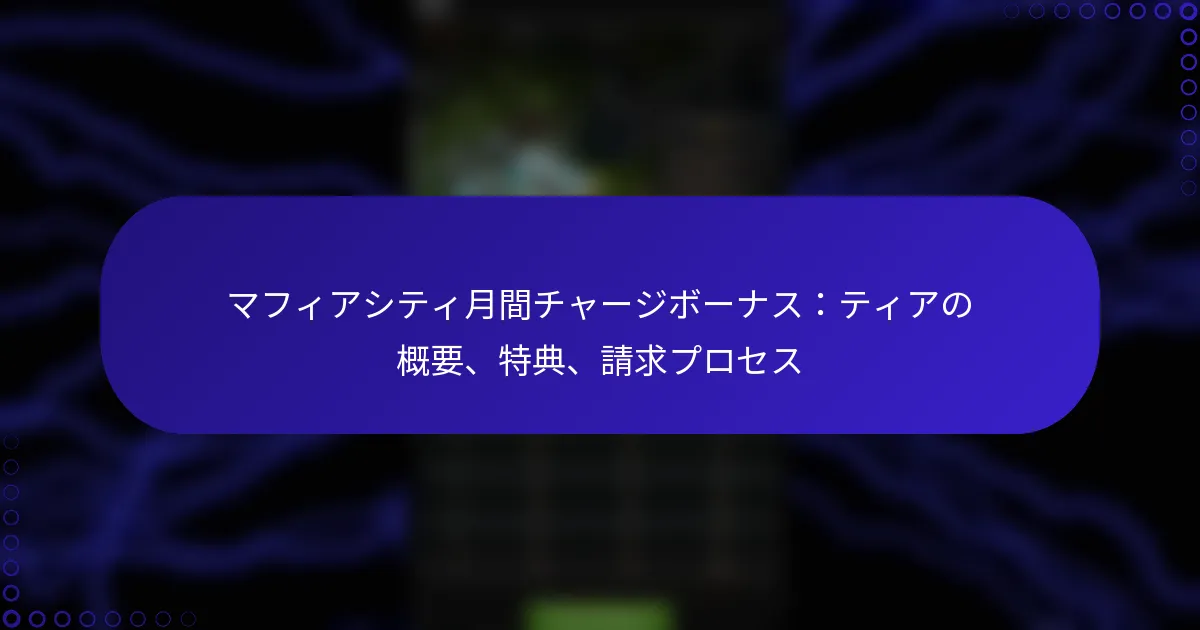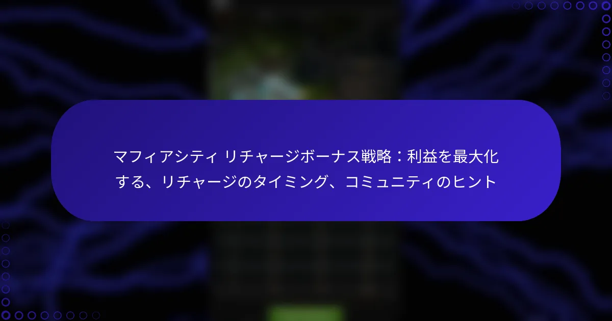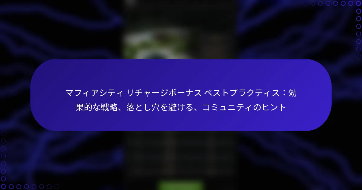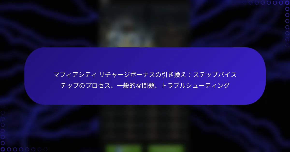 マフィアシティのリチャージボーナスの引き換えプロセスは、プレイヤーがゲーム内購入を通じて報酬を獲得し、ゲーム体験を向上させることを可能にします。しかし、プレイヤーはこれらのボーナスの引き換えを複雑にする一般的な問題に直面することがあります。これらの課題を理解し、トラブルシューティングの方法を知ることで、よりスムーズで報酬の多い体験につながります。 マフィアシティのリチャージボーナスの引き換えプロセスとは? マフィアシティのリチャージボーナスの引き換えプロセスは、プレイヤーがゲーム内購入を行った後に報酬を受け取ることを可能にします。このシステムは、ゲームプレイを向上させるボーナスを提供することで支出を促進しますが、プレイヤーはこれらの報酬を成功裏に引き換えるために特定の手順に従う必要があります。 リチャージボーナスシステムの概要 マフィアシティのリチャージボーナスシステムは、プレイヤーがゲームに対して行った金銭的投資に報いるように設計されています。プレイヤーがゲーム内通貨やアイテムを購入すると、ゲーム体験を向上させるために使用できるさまざまなボーナスをアンロックできます。これらのボーナスには、追加の通貨、限定アイテム、またはゲームプレイを助けるその他の特典が含まれることがあります。 このシステムは、プレイヤーが何かを受け取ることを知っているときに支出する可能性が高くなるように構成されています。このシステムの仕組みを理解することは、購入の利益を最大化するために重要です。 ボーナス引き換えのための資格基準 マフィアシティでボーナスを引き換えるには、プレイヤーは特定の資格基準を満たす必要があります。一般的に、これらの基準には、確認済みのアカウントを持っていることと、指定された期間内に最低限の購入を行うことが含まれます。プレイヤーは、互換性の問題を避けるために、ゲームのバージョンが最新であることを確認する必要があります。 確認済みのゲームアカウントを持っている必要があります。 最低購入金額が適用される場合があります。 ボーナスは購入後の特定の期間内に請求する必要があります。 これらの基準を満たさない場合、ボーナスの資格が得られない可能性があるため、プレイヤーは購入を行う前に要件を注意深く確認する必要があります。 ボーナス引き換えのためのステップバイステップガイド マフィアシティアカウントにログインします。 ゲーム内ストアに移動し、資格のある購入を行います。 ボーナスの資格を確認する通知をチェックします。 アカウント設定のボーナスセクションに移動します。 引き換えたいボーナスを選択し、引き換えを確認します。 これらの手順に従うことで、ボーナスを成功裏に引き換えることができます。このプロセス中に問題が発生した場合は、以下のトラブルシューティングのヒントを参照してください。 引き換えに必要な情報 ボーナスを引き換える際、プレイヤーはプロセスを完了するために特定の情報を提供する必要があります。通常、これにはアカウントの詳細、購入のトランザクションID、およびボーナスに関連するプロモーションコードが含まれます。この情報を準備しておくことで、引き換えプロセスがスムーズになります。 さらに、ゲームが引き換えに関して連絡を取る必要がある場合に備えて、連絡先情報が最新であることを確認する必要があります。アカウントを安全に保ち、情報を正確に保つことは、スムーズな体験のために不可欠です。 引き換え後の期待される結果 リチャージボーナスを成功裏に引き換えた後、プレイヤーは短期間内に報酬を受け取ることが期待できます。これには、追加のゲーム内通貨、限定アイテム、またはゲームプレイを向上させるその他の特典が含まれる場合があります。具体的な報酬は、購入や引き換えられる特定のボーナスによって異なる場合があります。 プレイヤーは、ボーナスが正しく適用されたことを確認するためにアカウントを監視する必要があります。期待される報酬が表示されない場合は、トラブルシューティングが必要な問題を示している可能性があります。 マフィアシティのリチャージボーナス引き換え中に発生する一般的な問題は何ですか? マフィアシティのリチャージボーナス引き換えプロセス中、プレイヤーはボーナスを成功裏に請求する能力を妨げるいくつかの一般的な問題に直面することがよくあります。これらの課題を理解することで、プレイヤーは効果的にトラブルシューティングを行い、よりスムーズな体験を確保できます。 支払い処理エラー 支払い処理エラーは、資金不足、誤った支払い詳細、または支払いプロバイダーの問題など、さまざまな理由で発生する可能性があります。これらのエラーは、プレイヤーが取引を完了し、ボーナスを請求することを妨げることがあります。 支払い処理エラーを最小限に抑